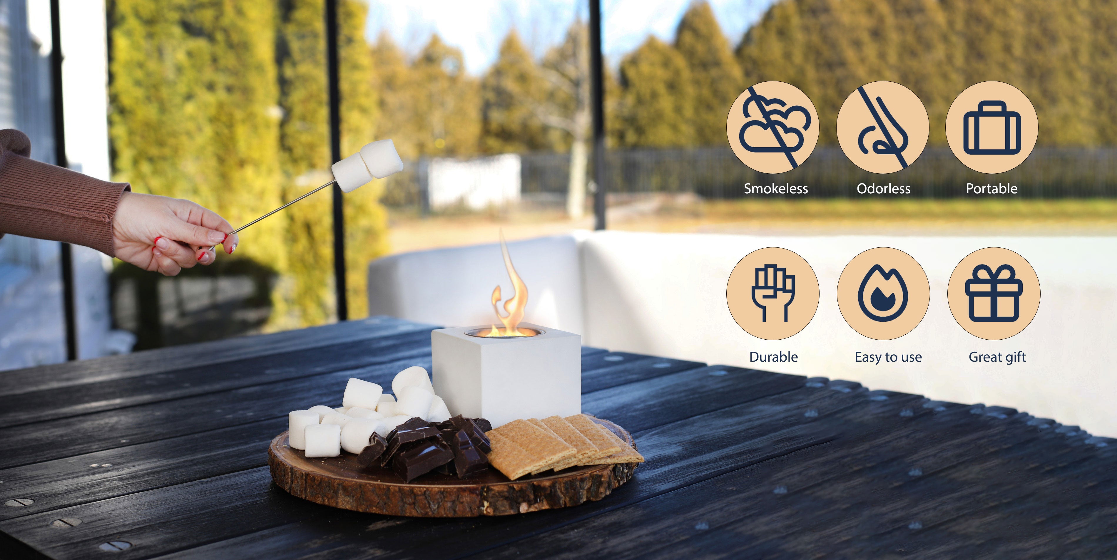 Roast marshmallows, hot dogs, or just sit back and enjoy a cozy fire with your smokeless, odorless table top firepit. The flame will last 1-2 hours.